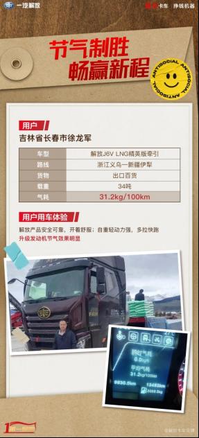 来自吉林省长春市的徐龙军师傅表示,他驾驶的是一辆解放J6V 530马力LNG精英版牵引车。平常他运送出口百货,往返于浙江义乌和新疆伊利线路徐师傅的车辆载重在34吨上下,气耗为31.2kg/100km,能够如此“省”,徐师傅认为这归功于解放J6V的自重轻带来成本优势。车辆自重方面的大幅优化,令J6V更贴合用户“多拉快跑”的需求,成为市场后起之秀。
