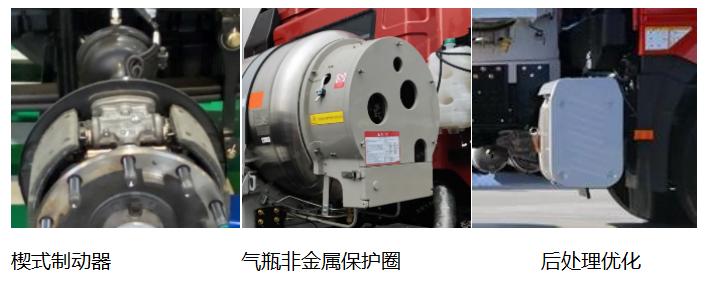 采用楔式制动器、气瓶非金属保护圈、轻量化后桥、后处理优化、高强碳钢LNG框架等11项降重措施,较其他品牌车型轻100kg以上,达到在同路况、同工况条件下,若按照运价0.2元/吨*公里,车辆自重相差0.1吨,年行驶20万公里计算,每年“轻量化”一项可较同行多收益4000元。